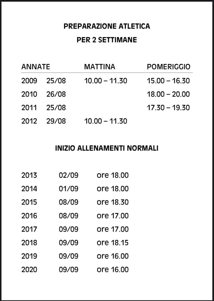 Ecco le date, giorni ed orari della ripresa degli allenamenti per la stagione sportiva 2025/26 ormai alle porte! consulta la sezione ALLENAMENTI per conoscere i giorni e gli orari regolari. GIOCA,CRESCI…SOGNA INSIEME A NOI!!!