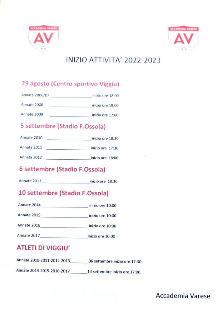 Calendario ripresa attività stagione 2022/2023